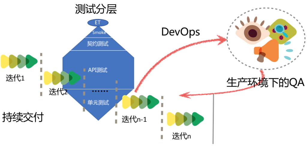 当然,光有符合这个策略模型的自动化测试是远远不够的,我们项目还采用了针对微服务特点的探索式测试,保持持续交付节奏,践行DevOps实践,结合生产环境下的QA等技术把关注点右移到生产环境。