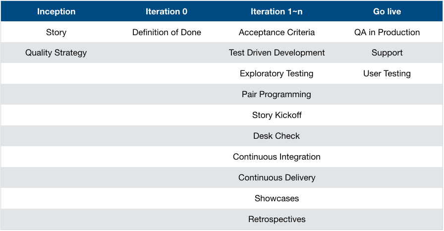 上表列出的是敏捷开发流程中的各个实践活动,它们都与质量有关,每个活动都要求多个不同的角色同时参与。