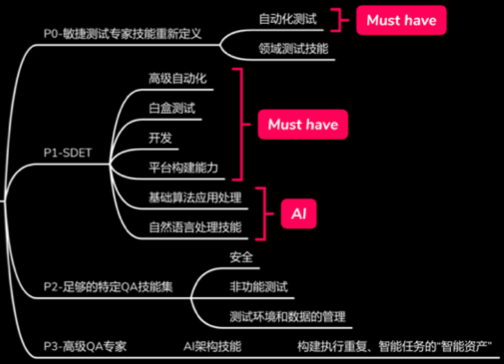 - P3 - 最后一个是高级QA专家,主要是AI架构技能,要求能够构建执行重复、智能任务的“智能测试资产”。鉴于目前AI技术的运用水平,对于这方面技能的培养可以稍缓,但的确是未来的一个发展方向。