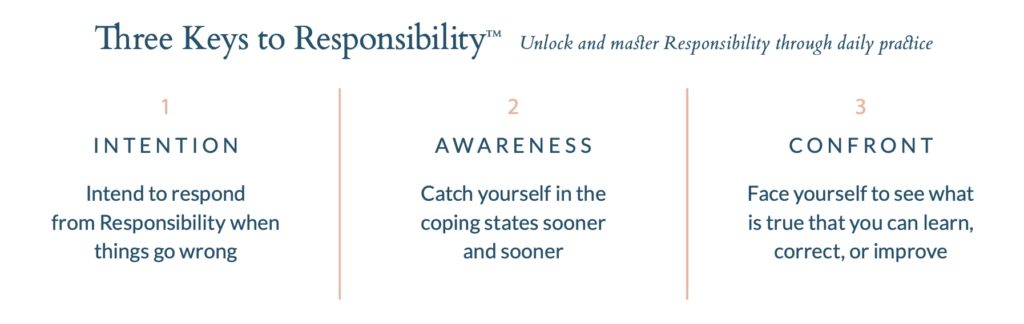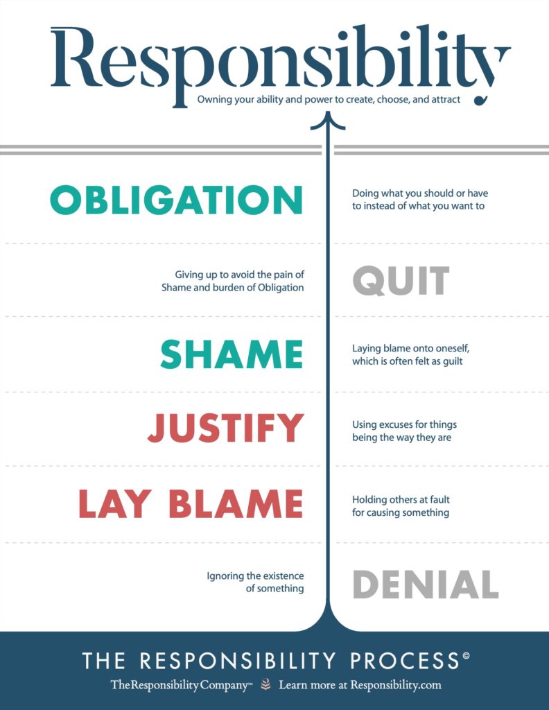 上图即为责任流程模型,从下到上需要经历几种不同的心理状态:否认、指责、辩解、羞愧、放弃、义务,然后才能到达最上层的“责任”,才能培养责任感。