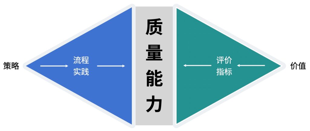 通过质量体系中的质量策略引导团队朝着质量目标方向前进,并且通过流程实践层面的指导,帮助团队提升质量能力。而另一方面,价值交付和质量水平可以作为评价指标来衡量团队质量能力状况,以帮助团队实现持续改进,促进质量能力的进一步提升。